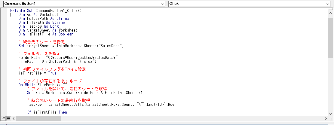 ・FilePathには、フォルダ内の最初のExcelファイルのパスを設定します。Dir(FolderPath & "*.xlsx")は、指定したフォルダ内の全てのExcelファイル(拡張子が.xlsx)を取得します。